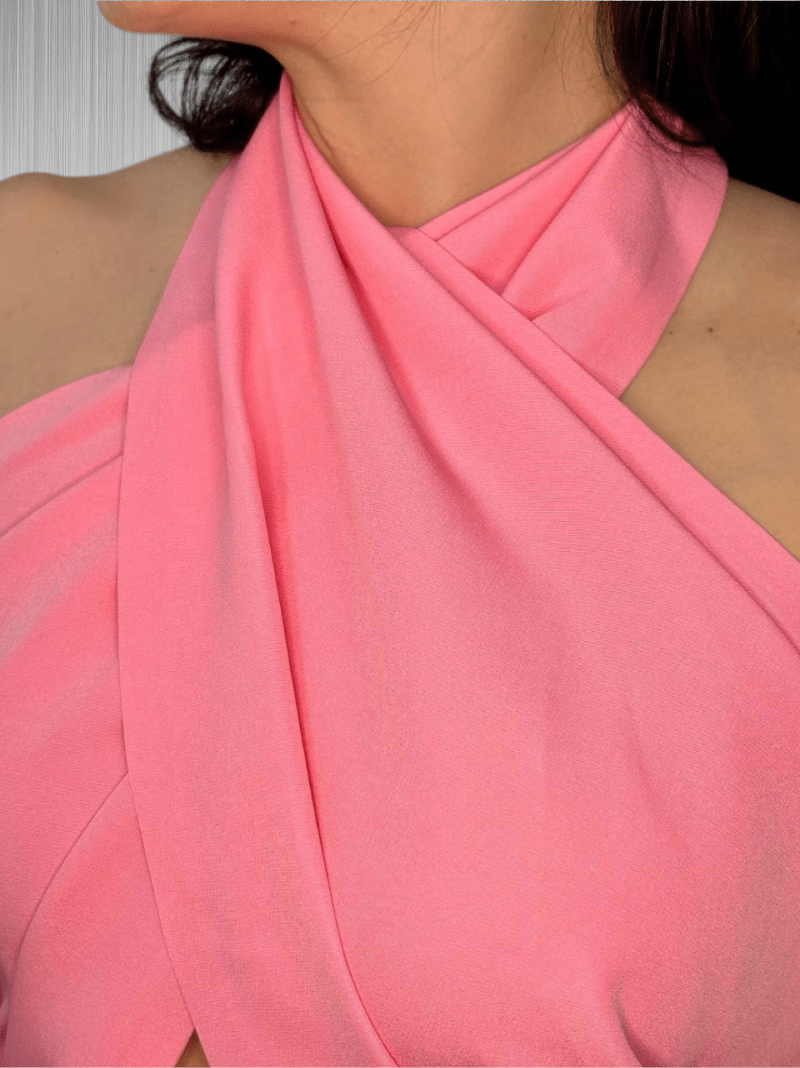 Это изящное розовое платье без рукавов с высоким воротником отлично подойдёт для создания элегантного образа. Стильный вырез на спине добавляет изысканный акцент, а приталенный покрой и деликатная оборка на подоле придают платью игривость и женственность. Этот наряд будет превосходным выбором для вечернего мероприятия или особого события.
